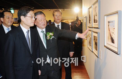 [사진공동취재단] 14일 오후 서울 종로구 세종문화회관에서 열린 고(故) 정주영 현대그룹 명예회장 10주기 사진전에서 정몽구 현대차그룹 회장이 김황식 국무총리에게 사진설명을 하고 있다.윤동주 기자 doso7@<ⓒ세계를 보는 창 경제를 보는 눈, 아시아경제(www.asiae.co.kr) 무단전재 배포금지>