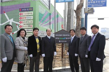 주흥남 아주산업 사장(오른쪽 세 번째)이 경기도 용인시 기흥구 상하동 수원사업소 주변 담장과 공터에 대한 환경개선 사업을 마무리하고 주민 등과 기념촬영을 하고 있다. <br /> <br /> <br />