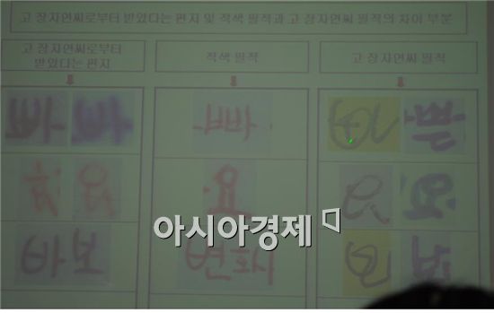 이어 양과장은 "적색필적은 정자체로 꼭꼭 눌러쓴 글씨"라면서 "편지원본은 흘림체라 두 문건을 각각 비교하기에는 부적합하다"고 말했다.국과수는 편지원본과 적색필적과의 대조를 통해 편지원본과 적색필적은 아래 받침을 'ㅊ'을 썼고 장씨의 원본에는 'ㅈ'이 쓰인점과 편지원본에 쓰인 '마니(많이)'가 적색 필적에도 '마니'로 쓰였지만 장씨의 원본에는 '많이'로 쓰인 점을 예로 들었다. 또 'OK'와 '함께'라는 필적을 예로 들며 전모씨의 필적과 동일한 필적인 것으로 분석됐다.하지만 국과수는 애매모호한 답변을 내놓았다. 양 과장은 "하지만 전모씨가 조작했다고 말할 수는 없다"며 "두 문건이 각각 정자체와 흘림체로 쓰여 있기 때문"이라고 설명했다.이어 "우리도 경찰 쪽에 증거자료를 수집 시 이러한 부분을 꼭 숙지하게끔 교육한다"며 "필체가 다르면 자료로서 부적합하다"고 덧붙였다.한편 이날 오후 2시 경기지방경찰청은 이번 사건에 대해 추후 어떻게 처리할지에 대해 브리핑할 예정이다스포츠투데이 강경록 기자 rock@<ⓒ아시아경제 & 재밌는 뉴스, 즐거운 하루 "스포츠투데이(stoo.com)">