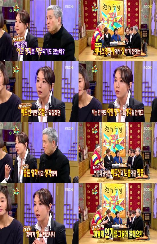 [스포츠투데이 박건욱 기자]배우 강수연이 영화 '씨받이' 촬영 당시 에피소드를 공개했다. 16일 오후 방송한 MBC '황금어장'의 한 코너 '무릎팍도사-임권택 감독 편'에 특별출연한 강수연은 "1987년 베스니 영화제에서 상을 타기 전에는 베드신에만 초점이 맞춰줬다"고 말했다. 그는 이어 "나는 한 번도 '씨받이'가 야한 영화라고 생각을 안했다. 오히려 슬픈 영화라고 생각했다"며 "하지만 언론의 관심은 베드신과 노출에만 집중이 됐었다. 당시 그것 때문에 너무 큰 상처를 받았다"고 고백했다. 강수연은 "하지만 갑자기 상을 타고 나니 '어떻게 연기를 그렇게 잘해요?'라는 질문을 많이 하더라"고 말해 웃음을 선사했다. 한편 이날 임권택 감독은 자신의 101번째 영화 '달빛 길어올리기'개봉을 앞두고 무릎팍도사를 찾아 어린 시절부터 거장이 되기까지 파란만장한 인생사를 속속들이 공개해 시청자들의 눈길을 끌었다. 스포츠투데이 박건욱 기자 kun1112@<ⓒ아시아경제 & 재밌는 뉴스, 즐거운 하루 "스포츠투데이(stoo.com)">