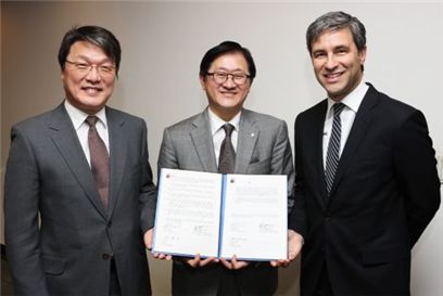 아모레퍼시픽 서경배 대표(사진 가운데)는 22일 서울 용산 본사에서 로스앤젤레스카운티미술관 마이클 고반 관장(오른쪽) 및 한국국제교류재단 김병국 이사장(왼쪽)과 MOU를 체결하고 향후 5년간 한국 현대미술 작품 구입비로 매년 20만달러(약 2억2400만원)를 LACMA에 지원키로 했다.