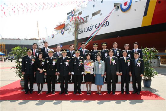 (앞줄 왼쪽에서 세번째부터 오른쪽으로) 강희승 진해기지사령관, 김충규 남해지방해양경찰청장, 모강인 해양경찰청장, (여덟번째)홍경진 STX조선해양 대표이사 부회장 등 참석자들이 24일 STX조선해양에서 거행된 해양경찰 1500t급 고속 경비함 '제민 13호'에서 기념촬영하고 있다.
