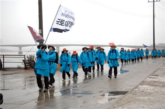 [아시아경제 백종민 기자] 대우증권(사장 임기영)의 신입사원들이 7년에 걸쳐 5천리(약 2000Km)를 국토대장정을 완주했다.25일 대우증권에 따르면 이 행사는 신입사원 입문과정의 하나로 매회 5박6일간 150~200km를 도보로 행군하면서 강인한 정신력을 배양하고, 동료간의 협동심과 리더십을 기르는 등 공동체 의식을 함양시키기 위해 마련됐다.지난 2004년 강원도 새말을 출발해 매년 1~2차에 걸쳐 하조대, 울진, 경주, 창원, 순천, 해남, 제주, 목포, 광주, 군산, 평택, 강화를 거쳐 이날 마지막 종착지인 여의도에 도착하며 유종의 미를 거뒀다.국토대장정에 참가한 신입사원 임재욱씨는 "힘들어 포기하고 싶을 때도 많았지만 끝까지 참고 견뎌서 완주했다는 점이 무척 자랑스럽다"며 "앞으로 어떤 어려움도 극복할 수 있다는 자신감과 뜨거운 동료애를 느낀 소중한 시간이었다"고 말했다. 대우증권 곽진석 연수부장은 “세찬 비바람과 영하의 기온도 가로막지 못한 5000리 행군이었다”며 “그동안 참가한 모든 신입사원에게 감사한다“고 소감을 밝혔다.대우증권 신입사원 국토대장정은 총길이 1963.6km를 7년간 11차수에 걸쳐 총 768명의 신입사원이 참여해 이뤄졌다.백종민 기자 cinqange@<ⓒ세계를 보는 창 경제를 보는 눈, 아시아경제(www.asiae.co.kr) 무단전재 배포금지>