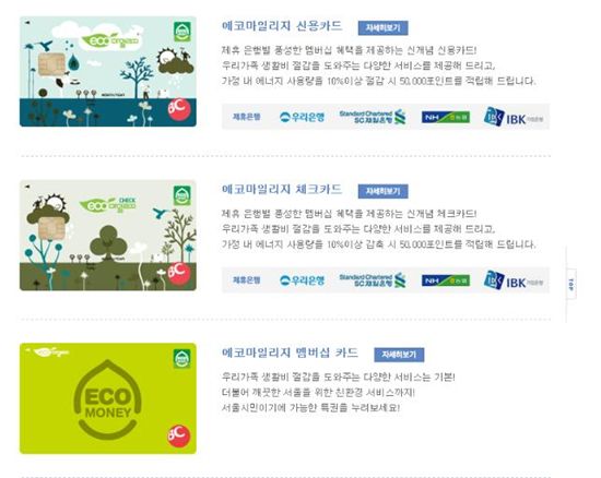카드를 이용해 녹색생활을 실천할 경우 소정의 마일리지를 제공해 주고 적립된 마일리지는 아파트 관리비, 이동통신 요금과 지방세 납부 등 에 현금처럼 사용할 수 있고 각종 문화시설 이용 요금을 할인 받을 수 있다.참여를 원하시는 구민은 인터넷 홈페이지(//ecomileage.seoul.go.kr)에 접속해 에코마일리지 회원으로 가입 후 가까운 참여은행(우리,제일,기 업은행, 농협)을 방문, 카드 발급을 신청하면 된다.산업환경과 (☎ 2289-1582)박종일 기자 dream@<ⓒ세계를 보는 창 경제를 보는 눈, 아시아경제(www.asiae.co.kr) 무단전재 배포금지>