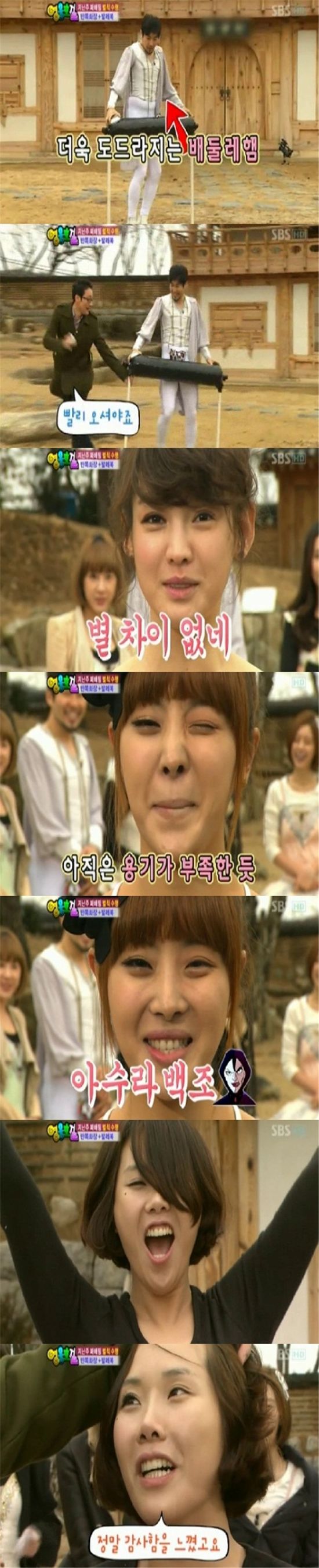 [스포츠투데이 최준용 기자]‘영웅호걸’ 멤버들의 반전 벌칙쇼가 펼쳐졌다. 27일 오후 방송된 SBS ‘일요일이 좋다’의 2부 ‘영웅호걸’에서는 지난주 펼친 대결에서 패배한 팀의 벌칙쇼가 그려졌다. 이날 방송에서는 지난주 국군위문공연 대결에서 패매한 팀의 반쪽 메이크업이 공개됐다. 노홍철 서인영 나르샤 정가은 신봉선 등은 발레리노, 발레리나 복장을 입고 등장 시청자들의 눈길을 사로잡으며 웃음을 자아냈다. 노홍철은 ‘홍철스키’로 변신해 시종 몸을 가리며 쑥스러운 모습을 보였고 여자 출연자들은 공개되는 반쪽 메이크업에 부끄러워 했다. 특히 나르샤는 ‘아수라 백조’라는 호칭을 얻어내며 완벽하게 다른 반쪽 메이크업을 보여줘 주위를 웃음바다로 만들었다. 이어 ‘세레나 봉’으로 변신한 신봉선은 동요 ‘곰 세 마리’를 섹시 버전으로 소화하며 최선을 다했다. 반쪽 메이크업 공개에서는 “메이크업을 해주시는 분에게 감사하다”고 소감을 전하기도 했다. 또한 이날 ‘영웅호걸’에서는 막걸리 제조현장을 방문, 멤버들이 직접 제조에 나섰다. 멤버들은 직접 막걸리를 빚어 보는 체험과 더불어 막걸리를 활용한 음식을 만들어 대결을 펼쳤다. 스포츠투데이 최준용 기자 yjchoi01@<ⓒ아시아경제 & 재밌는 뉴스, 즐거운 하루 "스포츠투데이(stoo.com)">