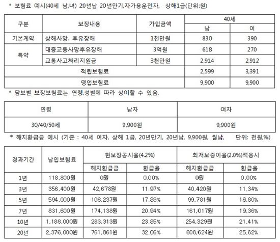 - 상기 예상해지환급률은 적립부분 순보험료(적립부분 영업보험료에서 회사운영경비를 차감한 금액)를 이 계약의 공시이율(2011.1월현재 4.2%, 단 2년이내 해지시 중도해지이율 )로 적립산출한 것으로 향후 이 계약의 공시이율, 계약내용변경, 보험료 실납입일등에 의해 변동될수 있음, 단, 최저보증이율 : 연복리 2.0%- 위 예시된 해지환급금은 미래의 수익을 보장하지 않음.- 해지환급금은 납입한 금액보다 적거나 없을 수도 있음.- 교통사고처리지원금,벌금, 방어비용, 긴급비용, 면허정지 위로금, 면허취소 위로금, 주차사고안심지원금, 자동차대인보험료할증지원금,구속시생활안정지원금은 음주, 무면허, 도주시 보상에서 제외됨.- 교통사고처리지원금,벌금,배상책임 담보는 다수계약시 비례보상함.- 영업용운전중 사고는 보상에서 제외됨.- 계약 전 알릴의무 위반시 계약이 해지되거나 보험금을 지급받지 못할 수 있음.- 청약한 날부터 30일 이내에 철회 가능.- 계약자가 청약시 계약자보관용 청약서(청약서 부본)를 전달받지 못하였거나, 약관의 중요한 내용을 설명 받지 못한 때 또는 계약 체결시 보험계약자가 청약서에 자필서명(날인 및 전자서명포함)을 하지 아니한 때에는 보험계약자는 청약일로부터 3개월 이내에 해당 계약을 취소할 수 있음.- 회사는 계약의 청약을 승낙하고 제1회 보험료를 받은 때부터 보장이 개시됨.- 보상하지 않는 손해 및 자세한 내용은 보험계약 체결전 가입시 알아두실 사항 및 약관, 상품설명서를 읽어보시기 바랍니다.- 보험계약자가 기존에 체결했던 보험계약을 해지하고 다른 보험계약을 체결하면 보험인수가 거절되거나 보험료가 인상되거나 보장내용이 달라질 수 있습니다- 이 보험은 예금자보호법에 따라, 본 보험회사에 있는 귀하의 모든 예금보험 대상 금융상품의 해지환급금에 기타지급금을 합한 금액을 예금보험공사가 1인당 최고 5천만원까지 보호합니다. - 회사의 업무처리와 관련된 문의사항 및 보험에 관한 분쟁이 있을 경우 당사 고객센터로 연락하시기 바라며, 처리결과에 이의가 있을 경우 금융감독원에 민원 또는 분쟁조정을 신청할 수 있습니다.손해보험협회 심의필 제2011-204호(2011.2.7)무료상담전화 : 080-890-3400※ 본 자료는 정보제공을 위한 보도자료입니다