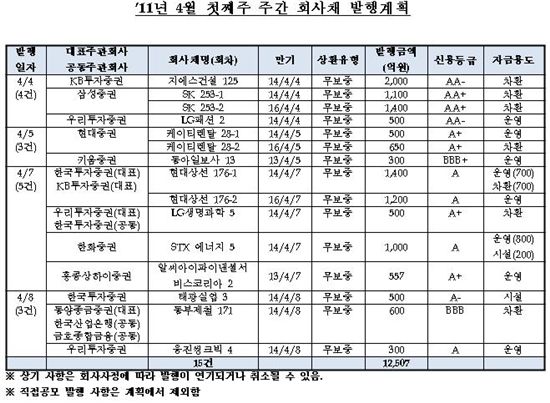 [아시아경제 김남현 기자] 다음주 회사채발행이 이번주보다 소폭 증가할 것이라는 전망이다. 차환용 수요가 꾸준히 이어지고 있다는 분석이다.금융투자협회가 1일 발표한 ‘4월 첫째주(4월4일~8일) 회사채 발행계획 집계 결과’에 따르면 한국투자증권과 KB투자증권이 대표주관하는 현대상선 176회차 2600억원을 비롯해 총 15건 1조2507억원의 회사채가 발행될 예정이다. 이는 이번주(3월28일~4월1일) 발행계획 11건 1조925억원에 비해 발행건수는 4건이, 발행금액은 1582억원이 증가한 것이다. 특히 7000억원 가량이 차환용도로 파악됐다.채권종류별로는 일반무보증회사채 12건 1조800억원, 금융채 2건 1150억원, 외화표시채권 1건 557억원이다. 자금용도는 운영자금 4857억원, 차환자금 6950억원, 시설자금 700억원이다.차상기 금투협 채권시장팀장은 “1조원이상 회사채발행이 계획돼 있어 이번주 활기를 이어갈 것으로 보인다. 차환용 수요가 꾸준히 있는듯 싶다. 이같은 수요가 지속될것으로 보인다”며 “이달 금통위까지 아직 시간이 남아있어 관련 경계감등에 대한 논의는 아직 없는듯 싶다. 금일 소비자물가지표도 나옴에 따라 지켜보는 상황인듯 싶다”고 전했다.
