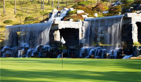 크리스탈카운티골프장 18번홀 그린 옆의 대형 폭포.