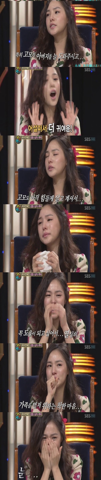 [스포츠투데이 고재완 기자]"노출이 많다고 지적해 속상하고 눈물이 났다"민효린은 지난 4일 방송한 SBS '밤이면 밤마다'에 출연해 이같이 털어놨다.화보 촬영 등을 통해서 '베이글녀'의 이미지를 부각시킨 민효린은 "활동을 하지 않아도 집의 생계를 유지해야하기 때문에 쉼 없이 화보 촬영도 했다. 또 드라마를 찍고 너무 어려보인다고 해서 작품이 들어오지 않았고, 제가 갖고 있는 다양한 매력을 보여주고 싶어서 언더웨어 광고도 촬영했는데, 사람들이 너무 '벗고 나오는 것' 아니냐. 노출이 많다고 지적해 속상하고 눈물이 났다"고 말했다.이어 그는 '명품코'라는 별명에 대해서는 "오똑한 콧날 때문에 사람들에게 성형을 했냐고 오해를 많이 받는다"며 "정말 코 높인 적이 없다. 있는 그래도 자연적인 코다. 코는 하지 않았지만 쌍커플이 짝짝이라서 살짝 집어 올리고 라미네이트는 했다"고 고백했다.민효린은 이날 또 "고모님이 아버지를 많이 도와주고 계신데, 사실 고모도 형편이 넉넉하지 못하다"며 "돈을 헛되게 사용하지 않고 모아서 고모집을 꼭 사주고 싶다"고 말하며 눈물을 쏟아내기도 했다.한편, 민효린는 다음달 4일 영화 '써니' 개봉과 11일 첫 방송하는 KBS 새 수목드라마 '로맨스 타운'을 통해 팬들을 만날 예정이며 건설, 음료, 치킨, 제과, 통신, 등의 광고 계약과 촬영을 앞두고 있다.스포츠투데이 고재완 기자 star@<ⓒ아시아경제 & 재밌는 뉴스, 즐거운 하루 "스포츠투데이(stoo.com)">