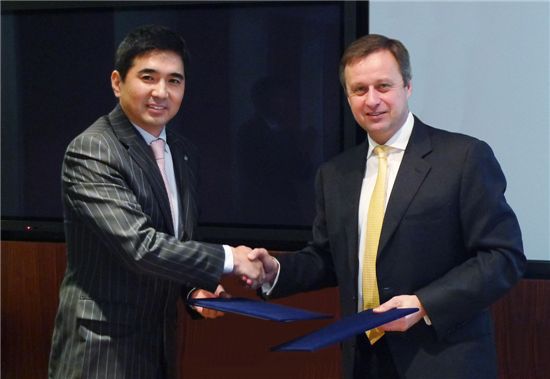 이형승 IBK투자증권 사장(왼쪽)과 클라이브 페그램(Clive Peggram) 파이낸셜리스크매니지먼트(FRM) 그룹 부사장이 지난 4일 영국 런던 FRM 본사에서 판매 계약을 맺고 악수하고 있다.<br />