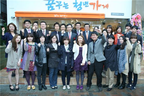 서울특별시 신면호 경제진흥본부장(사진 왼쪽에서 일곱번째)이 '꿈꾸는 청년가게'에 입주한 청년 창업가들을 격려하고 있다.