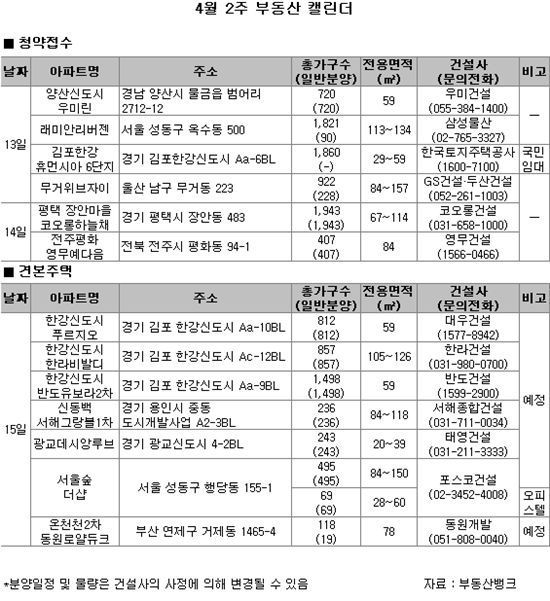 [아시아경제 문소정 기자] 지난주에 이어 울산, 경남 등 주요 지방도시에서 분양물량이 공급된다. 서울에서는 성동구 옥수12구역 재개발 일반분양 물량이 나온다. 특히 옥수12구역은 동호대교만 건너면 강남에 진입할 수 있어 강남권 출퇴근자들의 관심이 높을 것으로 보인다. 여기에 주 후반에는 한강신도시에 대우, 한라, 반도 등이 견본주택을 개관할 예정이다. 11일 부동산뱅크에 따르면 4월 둘째 주에는 전국 6곳에서 총 7673가구 중 3388가구가 분양될 것으로 조사됐다.