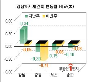 서울 강남권 4개구 재건축 아파트 매매가가 지난해 7월말 이후 일제히 하락세로 돌아섰다.<br /> 자료: 부동산 1번지