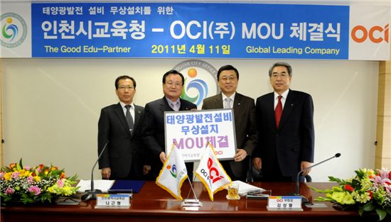 인천시교육청과 OCI가 11일 태양광설비 무상설치를 위한 MOU를 체결하고 있다. 좌로부터 이종원 인천시 부교육감, 나근형 인천시 교육감, 김상열 OCI 부회장, 박홍준 OCI 부사장.