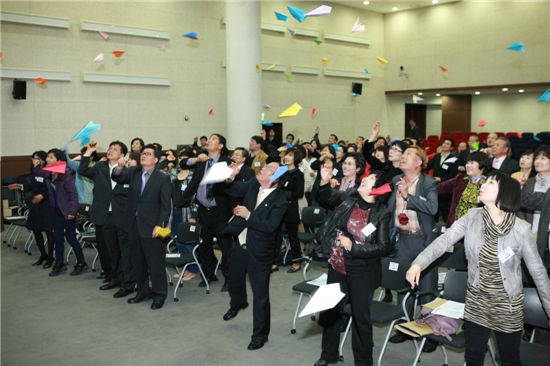 관악구 정책모니터단원들이 발대식에서 소망을 담은 비행기를 날리고 있다.