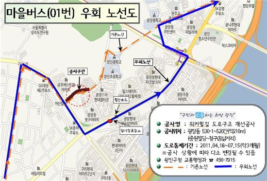 [아시아경제 박종일 기자]광진구(구청장 김기동)가 도로 급경사로 이용에 불편을 겪었던 광나룻길에 접한 워커힐길 진입로 개선공사를 시작한다.오는 18일부터 10월 30일까지 진행하는 공사는 워커힐길 진입로~구의아리수정수센터 관사 폭 15m, 길이 160m인 구간에 대해 경사로를 0~3.7m 낮춘다.공사로 인해 이 구간을 통과하는 마을버스 01번은 오는 18일부터 7월 15일까지 약 3개월간 교통 통제된다. 청구아파트와 한전삼거리 정류소가 당분간 폐쇄되고, 광장동 8차 현대아파트 노약자·장애인 셔틀버스 정류소가 임시 정류소로 운영된다.