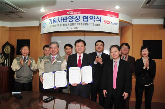 [아시아경제 채명석 기자] STX조선해양이 한국해양대학교와 손잡고 해양 플랜트 분야 맞춤형 전문인력을 양성한다.STX조선해양(대표 홍경진 부회장)은 해양대 글로벌선도 해양플랜트 인재양성센터(GLOPEC)와 ‘기술사관 양성 협약식’을 체결했다고 13일 밝혔다. 이날 STX조선해양 기술관 5층 회의실에서 열린 협약식에는 신상호 STX조선해양 대표이사 사장과 김태정 부사장, 조효제 GLOPEC 센터장, 박주용 부센터장 등이 참석했다.협약을 통해 STX조선해양은 GLPEC에서 교육 과정을 수료한 해양플랜트 건조 분야 맞춤형 전문 인력을 조기에 확보할 수 있게 됐다. 또한 해양플랜트 분야 공통 프로젝트를 수행하고, 해저자원개발에 필요한 각종 해양구조물 설계 및 관리 등의 해양플랜트 분야 기술을 축적할 수 있는 토대를 마련했다.신 사장은 “GLOPEC과 MOU를 체결함으로써 STX조선해양은 해양플랜트 산업을 선도하기 위해 입지를 구축하고 지역 우수 대학과의 유대관계를 강화했다는 데 의의가 있다”고 말했다.채명석 기자 oricms@<ⓒ세계를 보는 창 경제를 보는 눈, 아시아경제(www.asiae.co.kr) 무단전재 배포금지>