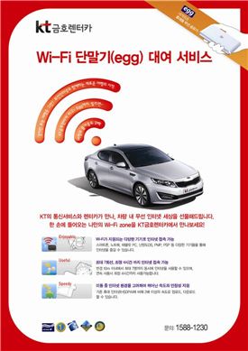 [아시아경제 임선태 기자]렌터카에서도 와이파이(WiFI)를 활용해 원활한 무선인터넷 사용이 가능해질 전망이다. 14일 KT렌탈(대표 이희수)은 KT금호렌터카 차량을 이용하는 고객들이 무료로 인터넷을 사용할 수 있도록 렌터카와 와이파이 에그(WiFi Egg)를 결합한 대여상품을 출시한다고 밝혔다. 이번 출시를 기념해 KT금호렌터카는 오는 6월 말까지 렌터카 이용고객 중 와이파이 에그를 사전에 예약한 고객에게 해당 상품을 무료로 대여하는 이벤트를 진행한다. 아울러 서비스 체험 후기를 KT금호렌터카 홈페이지에 올린 고객에게는 추첨을 통해 아이패드, 렌터카 무료이용권, 아웃백 외식 상품권 등 다양한 경품을 제공한다. KT금호렌터카를 이용하는 고객이라면 누구나 콜센터(1588-1230)와 인터넷 예약(www.ktkumhorent.com)을 통해 에그 대여가 가능하다. 현재 KT금호렌터카는 전국 130여개 렌터카 영업망과 총 6만여대의 렌터카를 운영하고 있다.임선태 기자 neojwalker@<ⓒ세계를 보는 창 경제를 보는 눈, 아시아경제(www.asiae.co.kr) 무단전재 배포금지>