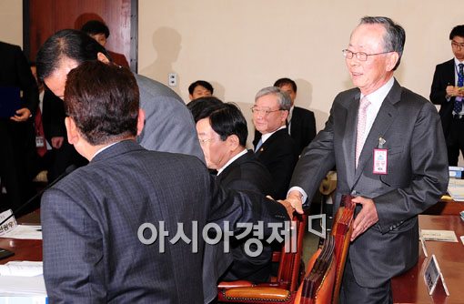 [아시아경제 윤동주 기자] 20일 국회에서 열린 저축은행 청문회에 증인으로 출석한 이헌재 전 장관(오른쪽)과 진념 전 장관이 인사를 나누고 있다.윤동주 기자 doso7@<ⓒ세계를 보는 창 경제를 보는 눈, 아시아경제(www.asiae.co.kr) 무단전재 배포금지>