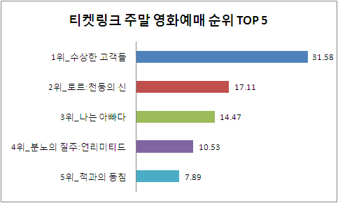 [스포츠투데이 강경록 기자]한국영화의 강세가 계속 이어지고 있다.27일 티켓링크(www.ticktink.co.kr)의 집계결과에 따르면 한국영화 '수상한 고객들'이 예매 점유율 31.58%를 기록, 예매 순위 1위를 차지했다.이어 2위는 '토르:천둥의 신이 17.11%를 기록했고 '나는 아빠다'가 14.47%로 3위를 차지했다. '분노의 질주: 언리미티드'가 10.53%로 4위, '적과의 동침'이 7.89%로 5위를 각각 차지했다.스포츠투데이 강경록 기자 rock@<ⓒ아시아경제 & 재밌는 뉴스, 즐거운 하루 "스포츠투데이(stoo.com)">
