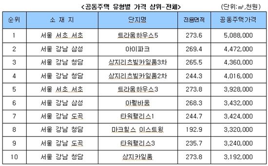 [공동주택공시]서초 트리움하우스5.. 50억8800만원 최고가<표>