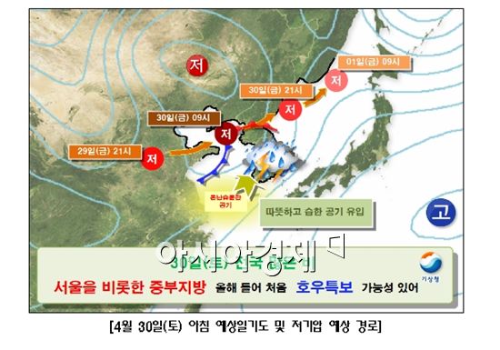 [아시아경제 김승미 기자]이번 주말 서울을 비롯한 중부지방에 최고 80㎜가 넘는 비가 내릴 것으로 전망된다. 비가 그치고 난 후에는 황사가 찾아오겠다.기상청은 서쪽에서 발달하는 저기압의 영향으로 29일 늦은 밤에 서해안지방에서 비가 시작돼 30일 전국으로 점차 확대되겠다고 28일 예보했다.강원영동 지방을 제외한 중부지방과 전북에는 30~60㎜(많은 곳 80㎜ 이상), 나머지 지방에는 5~40㎜의 비가 내릴 것으로 예상된다. 특히 30일 새벽 서울을 포함한 중부지방에 매우 많은 비가 내리면서 호우특보가 발표될 가능성이 있다고 기상청은 내다봤다.이번 비로 서울에 호우특보가 내려진다면 올해 들어 첫 호우특보이자 2002년 4월29일 이후로 4월에 발효되는 첫 사례로 기록될 전망이다.기상청 관계자는 "대기가 매우 불안정해 국지적으로 돌풍이 불고 천둥·번개를 동반한 시간당 20mm 이상의 강한 비가 내릴 가능성이 있다"고 덧붙였다.한편 28~29일 사이 내몽골고원 부근의 1.5㎞ 상공에서 바람이 강하게 불면서 황사가 발원할 것으로 보인다. 비가 그치는 30일 늦은 밤부터 서해5도를 시작으로 5월1일에는 전국에 짙은 황사가 나타날 가능성이 있어 주의가 요구된다고 기상청은 당부했다.김승미 기자 askme@<ⓒ세계를 보는 창 경제를 보는 눈, 아시아경제(www.asiae.co.kr) 무단전재 배포금지>