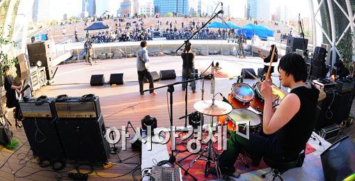 [아시아경제 조슬기나 기자] "록 윌 네버 다이(Rock will never die)!" 록(Rock)을 사랑하는 삼성맨들이 뭉쳤다. 20~30대 젊은 삼성맨들로 구성된 삼성전자 직장인밴드 ‘다크서클’은 28일 여의도 플로팅스테이지에서 열린 제 2회 아시아경제 직장인 밴드 대회 무대에 영화 The Fight의 주제곡 ‘Here I go again'을 들고 나왔다. 헤비메탈로는 드물게 빌보드 차트 1위에 올랐던 곡으로, 밴드활동을 하는 사람이라면 결코 모를 수 없다고 다크서클의 보컬 이동찬씨는 거듭 강조한다. 무대에 선 드럼 유경용(39), 보컬 이동찬(37), 기타 조철훈(36), 베이스 배지영(28), 키보드 김효경(30)은 총 60~70명에 달하는 밴드 다크서클에서도 둘째가라면 서러운 실력가들이다. 고교시절부터 음악에 빠져 밴드활동을 한 것은 물론, 직장 외에서도 각자 활동하는 밴드가 있을 정도.결성 4년차를 맞이, 매주 1회 이상 꾸준히 호흡을 맞춰온 밴드답게 대기실에서도 줄곧 여유가 넘쳤다. 리더 유경용씨는 마치 지금이라도 무대로 뛰쳐 나가고 싶다는 듯 손에 쥔 스틱으로 끊임없이 리듬을 만들어냈다. 지난해 ‘제 1회 아시아경제 직장인 밴드 대회’ 무대에 올라 한바탕 신나게 즐겼다는 이들은 올해도 무대에서 ‘이것이 록’이라고 보여주겠단다. 각오를 묻는 질문은 단 한 문장으로 끝난다. "Rock will never die!"기업의 노사화합을 다지기 위해 열린 이날 대회에는 SK텔레시스, 삼성전자, 남양주경찰서, 현대중공업, 두산인프라코어, 현대엠코, 현대자동차, 싸이버로지텍, 부천119구조대 등 총 9개 본선 진출팀이 참가해 열띤 경합을 벌였다.대회를 축하해주기 위해 박재완 고용노동부 장관을 비롯해 신현만 아시아경제 사장이 참석, 자리를 빛냈다. 심사위원으로는 그룹 백두산의 기타리스트 김도균과 전용석 음악감독이 자리했다.조슬기나 기자 seul@<ⓒ세계를 보는 창 경제를 보는 눈, 아시아경제(www.asiae.co.kr) 무단전재 배포금지>