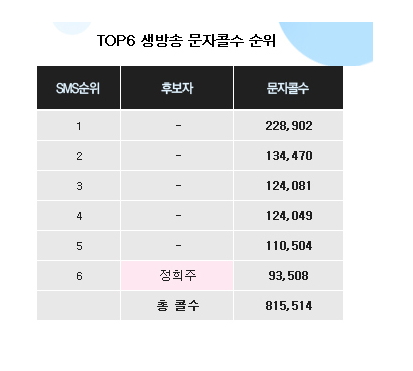 MBC <위대한 탄생>이 2일 공식 홈페이지를 통해 지난 29일 방송된 TOP6 생방송 무대의 문자 투표 순위를 발표했다.발표 결과에 따르면 1위는 22만 8,902건의 문자 투표를 받았다. 13만 4,470건을 받은 2위 참가자보다 10만건 남짓 되는 문자 투표를 더 받았다. 한편 탈락한 정희주는 9만 3,508건을 받은 것으로 밝혀졌다.이번 결과 발표는 여전히 멘토 점수를 삭제해 발표되었다. 그러나 네티즌들 사이에선 지난 투표 결과에 이어 여전히 김태원 멘토 팀에서 상위권을 차지했을 거라는 예상이 나오고 있다.29일 방송에서 탈락한 정희주는 심사위원 평가에서는 1위에 올랐으나 문자 투표에서 9만 3,508건으로 탈락해 여러 뒷말을 남겼다. 인기투표로 전락한 문자 투표 방식에 대한 비판과 개선의 목소리가 높다. 또한 동시간대 방송된 세계피겨선수권 대회의 영향이라고는 하나 지난번에 비해 급격히 줄어든 문자 투표수는 특정 멘티가 계속 강세를 보이는 <위대한 탄생>이 점점 시청자의 관심을 잃어가고 있는 것이 아니냐는 우려의 목소리도 함께 나오고 있다. 지난 <위대한 탄생>의 전체 문자 투표수는 130여만 건이었으며, 이번에 공개된 <위대한 탄생>의 전체 문자 투표수는 80여만 건을 기록했다.10 아시아 글. 김명현 기자 eighteen@<ⓒ즐거움의 공장 "10 아시아" (10.asiae.co.kr) 무단전재 배포금지>