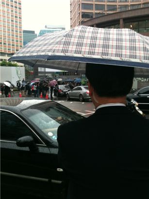 ▲ 10일 서울 소공동 웨스틴조선호텔에서 정용진 신세계 부회장과 한지희 플루티스트의 결혼식이 열렸다. 사진은 비공개로 진행된 결혼식에 참석한 하객들의 신분 노출을 차단하기 보안요원들이 은색 우산을 펼쳐 가리고 있는 모습.