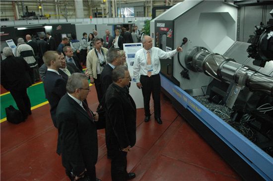11일 경남 창원 두산인프라코어 공작기계 공장에서 개막한 ‘두산국제공작기계전시회’(DIMF)에서 해외 고객들이 전시장을 둘러보고 있다.