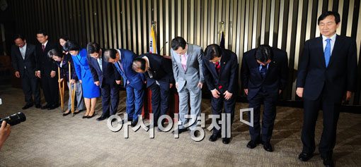 [아시아경제 윤동주 기자] 11일 오후 서울 여의도 국회에서 열린 한나라당 의원총회에서 황우여 원내대표와 신임 원내대표단이 인사를 하고 있다.윤동주 기자 doso7@<ⓒ세계를 보는 창 경제를 보는 눈, 아시아경제(www.asiae.co.kr) 무단전재 배포금지>