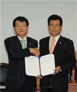 남인석 중부발전 사장(왼쪽)과 이시종 충청북도 도지사. <br />