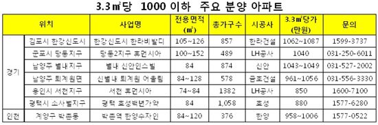 [아시아경제 문소정 기자] 분양시장의 장기적인 침체로 수요자들이 분양가 거품을 뺀 분양사업장으로 몰리면서 미분양이 꾸준히 줄고 있다. 언제 다시 불어 닥칠지 모를 전세대란에 대한 '보험용'으로 가격 부담이 적은 아파트를 골라 계약에 나서고 있는 것.특히 분양아파트는 단기간에 목돈을 들어가야 하는 기존아파트 매매와 달리 계약금만 있으면 계약이 가능하고 나머지 분양대금을 입주 때까지 분산할 수 있어 자금이 부족한 실수요자에게는 매력적인 주택상품이다. 이에 따라 잘 고르면 흙 속의 진주를 골라낼 수 있다. 한 부동산 전문가는 "가격이 저평가 돼있는 단지 중 교통망 확충, 기반시설 조성 등 개발호재를 갖춘 지역을 위주로 고르면 기대차익까지 노려볼 수 있다"고 말했다. 다음은 3.3㎡ 당 1000만원 내외인 주요 분양아파트에 대한 소개다.