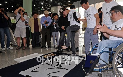 [아시아경제 이재문 기자]19일 서울 마포구청 로비에서 열린 마포캘리그라피학교 전시회 ‘희망’에서 한 장애인이 발로 글씨를 쓰고 있다.이재문 기자 moon@<ⓒ세계를 보는 창 경제를 보는 눈, 아시아경제(www.asiae.co.kr) 무단전재 배포금지>