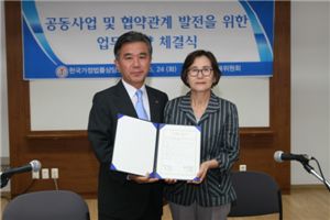 이종휘 신용회복위원장(외쪽)과 곽배희 한국가정법률상담소장이 업무협약 후 기념촬영을 하고 있다.