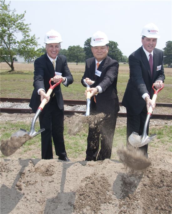 LS전선(회장 구자열)은 26일(현지시간) 미국 노스캐롤라이나 주 타버러 시에서 국내 최초로 미국에 전력 케이블 공장 기공식을 가졌다. 손종호 LS전선 사장(가운데)과 스티븐 카터 SPSX 사장(왼쪽), 저스틴 디디 부사장이 시삽을 하고 있다.
