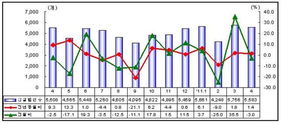 [아시아경제 김대섭 기자] 올해 4월 신설법인은 5583개로 전년동월비로 1.4%(75개) 증가해 2개월 연속 증가한 것으로 나타났다.29일 중소기업청에 따르면 '2011년 4월 신설법인 동향'을 조사한 결과 당월로서는 2003년 이후 가장 높은 실적을 기록했다. 전월비로는 3.0%(173개) 감소한 것으로 조사됐다. 1~4월 누계 신설법인은 2만1248개로 최근 5년간 같은 기간 누계 평균(1만8892개)을 12.5%(2356개) 초과했다.업종별 전월비를 살펴보면 제조업은 증가했지만 건설업과 서비스업은 감소했다. 전년동월비로는 서비스업은 증가했지만 제조업과 건설업은 감소한 것으로 조사됐다. 특히 건설업은 전년동월비로 12개월 연속 감소세다.지역별 전월비로는 경남과 울산 등을 포함한 5개 시도에서 증가했다. 전년동월비로는 제주와 전남 등을 포함한 9개 시도에서 증가했다. 연령대별 전월비는 30세 미만(2.7%)과 60세 이상(4.8%)이 증가했다. 전년동월비로는 50대(17.3%)와 60세 이상(25.6%)은 증가했고 나머지는 감소했다. 자본금규모별 전월비는 10억 초과~50억 이하(0.0%)와 50억 초과(15.4%)를 제외한 나머지 구간은 모두 감소했다. 전년동월비로는 5000만원 이하(△1.9%)와 5억 초과~10억 이하(△22.5%)를 제외한 나머지 구간은 모두 증가한 것으로 집계됐다.김대섭 기자 joas11@<ⓒ세계를 보는 창 경제를 보는 눈, 아시아경제(www.asiae.co.kr) 무단전재 배포금지>