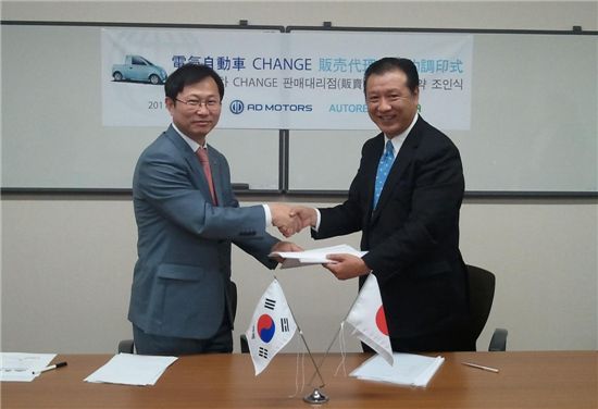 [아시아경제 이정일 기자] AD모터스(대표 류봉선)가 전기차 '체인지'를 향후 3년간 4000대를 일본에 수출한다.AD모터스는 지난 27일 일본자동차공정검정협회(이하 NAFCA) 수입대행사인 오토렉스사와 이같은 내용의 판매 계약을 체결했다고 30일 밝혔다. 이날 요코하마에서 열린 NAFCA 이사회에서 AD모터스, 오토렉스, NAFCA 등 3사 대표는 일본지역 판매 대리점 계약을 체결했다. 이에 따라 AD모터스는 오토렉스를 통해 향후 3년간 체인지 4000대를 공급할 수 있게 됐으며, 900억원 이상의 매출을 거둘 것으로 기대된다.이번 계약에 따라 오토렉스는 현지 광고를 실시하는 한편 A/S 네트워크를 구축해 고객 관리를 책임진다. AD모터스측은 "오토렉스와 NAFCA는 일본 전역에 폭넓은 판매 네트워크망을 구축하고 있어 체인지 대량 공급이 가능할 것"이라고 밝혔다.앞서 AD모터스는 지난 달 25일 체인지의 일본 수출에 필요한 일본 국토교통성의 ’수입인증검사’를 완료했다. 류봉선 AD모터스 대표는 "일본 수출을 시작으로 미국, 유럽 등에도 체인지 공급을 위해 노력하겠다"고 말했다.이정일 기자 jaylee@<ⓒ세계를 보는 창 경제를 보는 눈, 아시아경제(www.asiae.co.kr) 무단전재 배포금지>