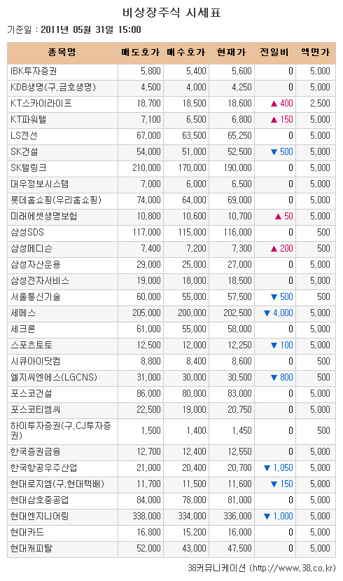[아시아경제 천우진 기자]비상장주식 시장이 사흘만에 하락세로 돌아섰다.IPO(기업공개) 관련주로 다음달 3일 코스피 상장 예정인 위성방송 사업자 KT스카이라이프가 1만8600원(+2.20%)으로 3거래일 연속 올랐다. 다음달 30일 공모 예정인 반도체 테스트업체 테스나는 1만2000원(+11.63%)으로 급등하며 신고가 행진을 이어갔다.오는 1일 공모 예정인 LCD 필름검사 장비업체 넥스트아이가 1만2200원(-4.31%)으로 내려 11거래일 동안 약세가 지속됐다. 다음달 8일 공모 예정인 패션의류 업체 엠케이트렌드는 1만3500원(-3.57%)으로 하루 쉬고 다시 내려 5주 최저가로 밀려났다.상장 승인 관련주로 이차전지 전해액 소재 제조업체 리켐이 1만7000원(-1.45%)으로 4거래일 연속 내렸다. 상장 심사 청구 관련주로 비금속 광물제품 제조업체 사파이어테크놀로지가 9만7500원(-0.51%)으로 빠졌고 케이맥과 뉴로스가 동반 하락 했다.삼성 관련주로 초음파 진단기 전문기업 삼성메디슨이 7300원(+2.82%)으로 사흘 연속 올랐다. 반도체 세정장비업체 세메스는 20만2500원(-1.94%)으로 7거래일 연속 하락했다. 홈 네트워크 전문기업 서울통신기술은 5만7500원(-0.86%)으로 하루 쉬고 다시 내려 5주 최저가를 갈아치웠다.범 현대 계열 관련주로 토목엔지니어링 서비스업체 현대엔지니어링이 33만6000원(-0.30%)으로 이틀 쉬고 다시 약세가 이어졌다. 현대그룹 종합 물류기업 현대로지엠은 1만1600원(-1.28%)으로 사흘 연속 내렸다.그 밖에 생명보험사 미래에셋생명이 1만700원(+0.47%)으로 올라 사흘 연속 상승했다. 차량용 카메라 모듈 개발업체 엠씨넥스는 1만500원(+1.45%)으로 나흘 연속 올랐으나 SK그룹사 SK건설과 체육복표 발행 사업자 스포츠토토는 각각 5만2500원(-0.94%), 1만2250원(-0.81%)으로 하락하며 장을 마감했다.자료제공: