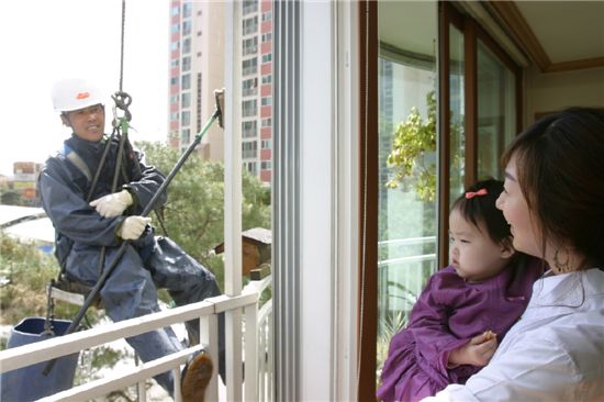 대림산업은 아파트 입주민을 위해 오렌지 서비스를 제공하고 있다. 사진은 오렌지서비스 중 맑은하늘서비스(유리창청소서비스)를 진행하고 있는 모습이다.