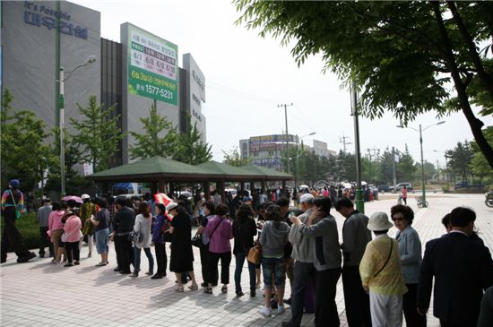 [아시아경제 이은정 기자] 경기도 시흥시에 모처럼 모델하우스 방문객이 줄을 서는 진풍경이 연출됐다.대우건설은 경기도 시흥시 죽율동 시흥6차 푸르지오 모델하우스 개관 첫 날인 3일 오후 1시까지 3000명의 방문객이 다녀갔다고 밝혔다. 이날 모델하우스에는 오전부터 방문객들이 몰려 모델하우스 밖으로 500m 가량 줄을 길게 늘어서는 광경이 연출됐다.시흥6차푸르지오는 지하 2층, 지상 23층 33개 동으로 총 1903가구 규모이며 이 중 769세대를 1차로 먼저 공급하고 추가로 나머지 1134세대를 공급할 예정이다. 6월에 공급하는 1차분은 전용면적 기준 59㎡ 158세대, 84㎡ 367세대, 107㎡ 244세대로 구성됐다. 분양가는 평균 840만원대.대우건설 관계자는 "1990년대 중반 이후 신규 단지 공급이 거의 없었던 시흥 일대에 10년 만에 대단지 아파트가 공급되면서 사람들의 관심이 높은 것 같다"고 말했다.이은정 기자 mybang21@<ⓒ세계를 보는 창 경제를 보는 눈, 아시아경제(www.asiae.co.kr) 무단전재 배포금지>