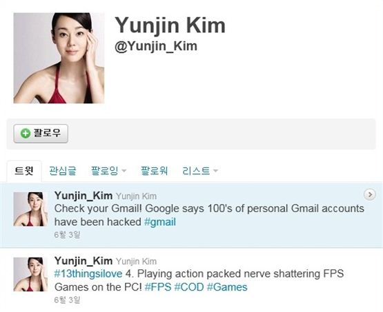 배우 김윤진의 트위터로 알려졌던 @Yunjin_Kim 계정이 김윤진을 사칭한 트위터인 것으로 밝혀졌다. 이 계정의 주인은 2009년 11월 21일 “This friend of mine told, twitter's good.. lemme see..”라는 첫 트윗을 남긴 후 최근 6월 3일까지 트위터에 글을 남겼다. 계정의 주인은 영어로만 트위터를 운영했으며 2010년 5월 27일에는 김윤진이 출연했던 미국 드라마 < Lost >를 언급하며 “finally Lost’s over, I’m so happy!”라는 트윗을 남기기도 했다. 현재까지 이 계정에는 116개의 트윗이 올라와 있으며 팔로잉은 6,210명, 팔로워는 8,879명으로 기록된 상태다. 김윤진의 소속사 자이온엔터테인먼트 이성창 팀장에 따르면 “김윤진 씨의 트위터 계정이 있는지 모르고 있다가 한 기자에 의해 할게 됐다”며 “본인에게 확인한 결과 이 트위터는 김윤진 씨가 만든 것이 아니었고 김윤진 씨는 현재 어떠한 SNS도 사용하고 있지 않다”고 말했다. 이성창 팀장은 “아직은 트위터 사칭한 사람이 국내인인지 외국인인지 확인되지 않았다. 확인되는 대로 조치를 취하려 준비중이다”라고 덧붙였다. 현재 김윤진은 올 여름 촬영될 국내 영화 시나리오를 긍정적으로 검토하고 있다고 알려졌다. 10 아시아 글. 한여울 기자 sixteen@<ⓒ즐거움의 공장 "10 아시아" (10.asiae.co.kr) 무단전재 배포금지>