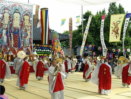[아시아경제 오진희 기자] 애이에~ 어으어흐~ 이이이~~아~~스님들의 범패소리가 장엄하게 들려왔다. 염불당 앞마당에는 괘불이 모셔져 있고 이를 중심으로 양측에는 12간지 그림과 복을 기원하는 글씨들이 매달려 있다. 오른편 멀리서는 취타대가 연주하는 각종 악기소리가 들리고, 시간에 따라 스님들이 선보이는 바라춤과 나비춤 그리고 법고춤을 구경하고자 많은 사람들이 주변을 에워싸고 있었다.서울 시내 한복판에 자리한 천년이 더 된 오래된 사찰. 889년 신라 진성여왕 3년에 창건된 봉원사를 비추는 뜨거운 햇살만큼 바라보는 이들도, 의식을 치르는 스님들도 화려하면서도 엄숙한 분위기에 젖어들었다. 현충일이었던 지난 6일 서울 서대문구 봉원사에서는 산 자와 죽은 자 모두가 부처님의 참 진리를 깨달아 번뇌와 괴로움에서 벗어날 수 있게 한다는 성대한 불교의식인 영산재(靈山齋)가 열렸다.오전 10시부터 거행된 이 재는 3부로 나눠져 저녁 7시까지 끊임없이 이어졌다. 영산재는 부처상을 건다는 뜻의 괘불을 중심으로, 각종 불교 공예품들인 장엄들을 꾸리고 부처님을 모시는 의식이 1부, 부처님의 공덕을 찬양하는 노래인 범패와 불교무용으로 잔치를 벌이는 장인 2부, 그리고 번뇌를 털고 공으로 돌아간다는 회향식이 3부로 구성돼 있었다. 영산재는 지난 2009년 9월 유네스코 세계무형문화재로 등재되면서 불교예술이자 전통문화로서의 가치를 국제적으로 인정받았다. 이 후 영산재의 명맥을 잇고 교육하고 있는 봉원사 영산재 보존회는 중국과 일본을 비롯한 여러 나라에서 초청을 받아 시연을 선보이고 있다. 이날 봉원사의 주지스님이자 영산재보존회 회장인 일운 스님(본명 마명찬)을 만나 영산재에 대해 이야기를 나눴다.봉원사 주지인 일운(마명찬) 스님