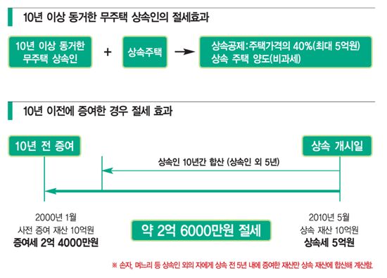 또한 상속세는 증여세에 비해 각종 공제 혜택이 많다. 따라서 상속 재산의 규모와 상속인의 수, 상속·증여 공제 등을 생각해야 한다. 사례의 이씨가 재산 60억원 중 10억원이라도 미리 증여했다면 얼마의 세금을 절약할 수 있었을까? 현재 상속이 일어난다면 재산 10억원의 50%인 5억원이 세금이다. 상속 10년 이전에 자녀에게 증여했더라면 재산10억원에 대해 2억 4000만원의 증여세만 부담하면 된다. 10억원의 사전 증여로 인해 총 2억 6000만원(=5억원-2억 4000만원)의 세금을 절약할 수 있다.10년 단위로 나눠 증여 때 최대 효과증여세도 상속세와 마찬가지로 10년 이전에 증여한 재산이 있었다면 그것까지 합산해 계산한다. 따라서 10년 기준으로 ‘상속·증여 중장기 10년 계획’을 세우면 절세가 가능하다. 50세인 김씨의 경우도 10년 단위 계획을 세우기에 충분한 나이다. 80세에 상속이 일어난다고 가정하면 10년 단위로 나눠 증여할 경우 50세, 60세, 70세 세 번에 걸쳐 절세 기회를 얻기 때문이다. 김씨가 앞과 같이 재산을 10년 단위로 10억원씩 세 번에 걸쳐 증여하게 되면 70세에 한꺼번에 30억원을 증여하는 것보다 3억 2000만원의 세금이 줄어든다.증여세는 재산을 받는 사람 기준으로 세금을 계산한다. 따라서 같은 금액의 재산을 증여하더라도 증여받는 사람의 수를 늘리면 세율이 낮아진다. 또한 사람별로 다르게 적용되는 증여재산공제도 활용하면 좋다. 배우자에게 증여하면 10년간 6억원까지는 증여세가 없고 성인 자녀의 경우에는 3000만원(미성년자 1500만 원)까지 공제가 가능하다. 그 밖에 친족(며느리, 사위 포함)의 경우에는 500만원을 공제해준다. 예를 들어 자녀 2인에게 각각 2억원씩 총 4억원의 재산을 증여하고 싶다면 며느리, 사위까지 포함해 증여하면 좋다. 증여 재산 2억원까지는 20%의 세율이 적용되지만 1억원까지는 10%가 적용돼 세율을 낮추는 효과가 있고 인당 증여재산공제도 활용할 수 있다. 자녀가 많을수록 여러 명으로 분산 증여할 수 있어 더 많은 세금을 절세할 수 있다.투자할 때 수익률이 높은 자산에 투자하면 복리 효과가 더욱 커지는 것처럼 사전 증여도 가치가 더 많이 상승할 것으로 보이는 재산으로 선택하는 편이 좋다. 미래 가치가 높아 보이는 가치주나 이머징마켓에 투자하는 펀드, 장기 개발 호재가 있는 토지를 증여한다면 상대적으로 절세 효과가 더 커진다. 증여받은 사람이 그 재산을 운용함에 따라 발생한 수익은 증여로 보지 않기 때문이다. 또한 상속 재산 10억원 이하는 사전 증여하지 않아도 된다. 재산이 많지 않아 내야 할 상속세가 없다면 굳이 사전 증여할 필요가 없다. 일반적으로 자녀와 배우자가 살아 있다면 상속 재산 10억원까지는 상속세를 내지 않으며 배우자가 없고 자녀들만 있을 경우 최소 5억원까지는 세금이 없다. 낼 상속세가 없는 사람이 미리 증여해서 굳이 안 내도 될 증여세를 낼 필요는 없다. 단, 당장은 재산이 10억원이 넘지 않더라도 향후 자산이 불어날 수 있으므로 주기적인 점검을 통해 전략을 수정할 필요는 있다.주택 누가 상속받는지도 중요주택도 누가 상속받는지에 따라 향후 자녀들이 부담하는 세금이 달라진다. 상속받은 주택을 양도할 때 양도소득세에 차이가 날 수 있기 때문이다. 부모님과 10년 이상 계속 같이 살았던 주택을 무주택자인 자녀가 상속받는 경우에는 주택 가격의 40%(5억원 한도)를 상속 재산에서 공제받을 수 있다. 따라서 이미 분가해 주택을 소유하고 있는 자녀보다는 어머니와 함께 살아온 자녀가 상속받는 것이 절세에 유리하다. 양도소득세를 고려하더라도 어머니와 함께 살아 온 자녀가 상속받는 것이 유리하다.그 동안 어머니와 함께 거주해왔기 때문에 상속받은 주택을 양도하더라도 어머니의 거주 및 보유 기간을 그대로 이어받아 1세대 1주택 비과세를 받을 수 있기 때문이다.만약 부득이하게 분가한 자녀가 주택을 상속받아야 한다면 상속 주택을 팔 때 양도소득세를 내야 한다. 물론 기존에 보유하고 있던 주택을 먼저 처분하면 상속 주택과 관계없이 1세대 1주택 비과세를 받을 수 있다.이코노믹 리뷰 이학명 mrm97@<ⓒ 이코노믹 리뷰(er.asiae.co.kr) - 리더를 위한 고품격 시사경제주간지, 무단 전재 및 재배포 금지>