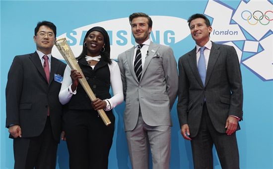 삼성전자가 2012년 런던올림픽 첫 성화봉송주자로 지역의 평범한 영웅을 선택했다. 사진 왼쪽부터 권계현 삼성전자 스포츠마케팅 담당 상무, 첫 성화봉송주자로 선정된 예비대학생 가브리엘라 로제, 축구스타 데이비드 베컴.
