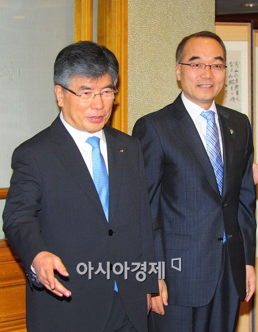 [아시아경제 윤동주 기자] 15일 서울 중구 은행회관에서 박재완 기획재정부 장관(오른쪽)과 김중수 한국은행 총재가 조찬 회동을 갖기 위해 회의장으로 들어서고 있다. 이날 조찬 회동은 박 장관 취임이후 첫 회동으로 최근 금융 현안 등 거시적인 한국 경제 전반에 대해 의견을 나누고 의해 열렸다.윤동주 기자 doso7@<ⓒ세계를 보는 창 경제를 보는 눈, 아시아경제(www.asiae.co.kr) 무단전재 배포금지>