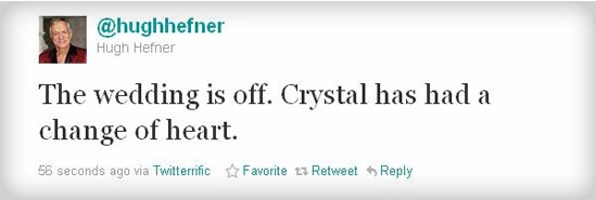 [아시아경제 온라인이슈팀] 성인잡지 '플레이보이' 창업자 휴 헤프너(85)가 결혼을 앞두고 연인에게 차였다.미국의 연예뉴스 사이트 TMZ닷컴은 헤프너의 약혼자로 알려진 크리스탈 해리스(25)가 결혼을 불과 5일 앞두고 돌연 마음을 바꿔 식이 취소됐다고 15일(한국시간) 보도했다. 휴 헤프너와 크리스탈 해리스는 2008년 할로윈 파티에서 만난 것으로 알려졌으며 지난해 말 무려 60살의 나이차를 극복하고 약혼해 화제가 됐다. 이 같은 소식이 언론 보도를 통해 공개되자 헤프너는 자신의 마이크로 블로그 트위터에 "결혼식이 취소됐다. 해리스가 마음을 바꿨다"는 글을 게재해 소식이 사실임을 암시했다.