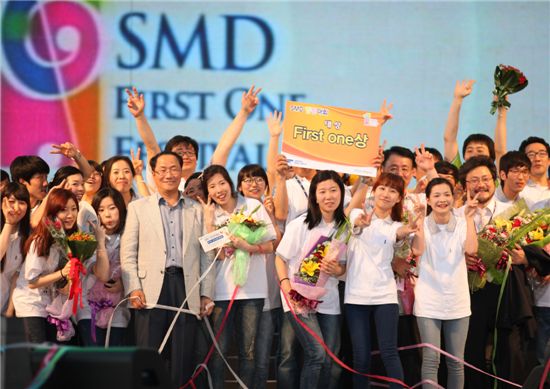16일 충남 아산시 탕정면 삼성디스플레이시티에서 열린 '삼성모바일디스플레이 퍼스트원 페스티벌'에서 조수인 사장과 합창대회 수상자들이 기념촬영을 하고 있다.