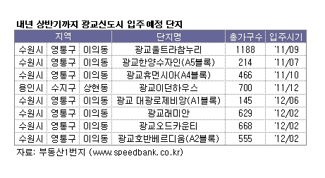 [아시아경제 조민서 기자]경기도 수원 '광교신도시'의 첫 입주가 코앞으로 다가왔다. 총 1130만㎡, 7만7000명을 수용하는 신도시로 개발중인 광교신도시는 공동주택만 3만1000여가구가 들어선다. 이중 A5블록의 '광교한양수자인' 214가구가 첫 주자로 다음 달 집들이에 나선다.16일 건설업체들에 따르면 올 연말까지 광교신도시의 입주물량은 총 2568가구다. 7월말 한양수자인 입주를 시작으로 9월에는 울트라참누리 1188가구, 10월 광교휴먼시아(A4블록) 466가구, 12월 광교이던하우스 700가구 등이 입주를 시작한다. 이중 첫 입주인 광교한양수자인은 4개동, 15층 규모, 총 214가구로 구성됐다. 가구수는 많지 않지만 실수요자들에게 인기있는 전용면적 85㎡이하의 중소형 단일면적으로 구성돼 있다. 본격적인 입주가 시작되는 내년에는 대형 브랜드 아파트들의 입주도 속속들이 진행된다. 2월에는 광교래미안(629가구), 광교오드카운티(668가구), 광교호반베르디움(555가구) 등이 준비돼있고, 6월에는 A1블록에 대광로제비앙 145가구가 입주를 기다리고 있다. 수도권 남부에 명품신도시를 만들겠다는 구상하에 조성된 광교신도시는 올 연말 준공을 목표로 기반시설 조성공사가 한창이다. 현재 공정률은 약 78% 정도다. 경기도시공사 관계자는 "공사 준공은 연말로 잡혀있으며, 순차적으로 입주가 진행될 것"이며 "조기입주자들을 위해서 생활에 필요한 기반시설, 수도, 전기 등 불편이 없도록 하겠다"라고 말했다.광교신도시는 신분당선 연장선의 최대 수혜지역으로 꼽힌다. 2016년이면 신분당선 연장선 경기대역이 개통예정이고, 2단계 광교~호매실 구간은 경부철도축(화서역)과도 연계돼 전국적인 교통망 접근이 쉽다. 분당 및 판교도 15분 거리다.조민이 부동산1번지 팀장은 "교통여건이 체계적으로 갖춰지고, 편의시설이 조성된다면 입지는 괜찮은 편이다. 강남권으로 출퇴근이 가능하다"라며 "내년 상반기까지 차례로 입주가 진행되기 때문에 전셋값이 저렴하게 나올 수도 있을 것으로 본다"라고 내다봤다. 광교 인근 K부동산 관계자는 "중소형 아파트는 분양 당시보다 현재 프리미엄이 2000만원 가량 붙었다고 들었다"라며 "신도시로써 자리를 잡으면 보다 많은 주목을 받게 될 것"이라 말했다. 조민서 기자 summer@<ⓒ세계를 보는 창 경제를 보는 눈, 아시아경제(www.asiae.co.kr) 무단전재 배포금지>