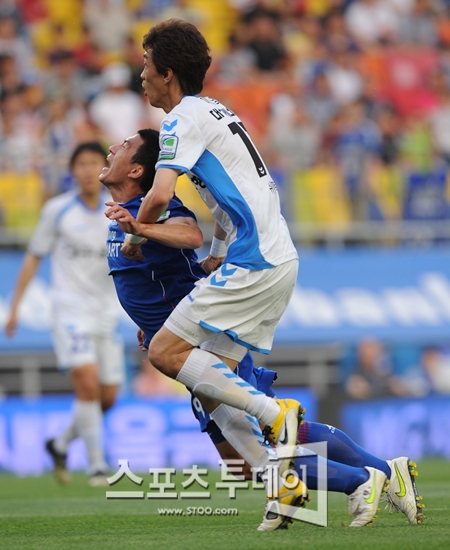 [수원=스포츠투데이 정재훈 기자] 18일 오후 수원월드컵경기장에서 열린 '현대 오일뱅크 K리그 2011' 수원 삼성과 대구FC의 경기에서 오장은(수원)이 페널티 에어리어 안에서 밀려넘어지며 페널티킥을 얻어내고 있다.스포츠투데이 정재훈 사진기자 roze@<ⓒ아시아경제 & 재밌는 뉴스, 즐거운 하루 "스포츠투데이(stoo.com)">